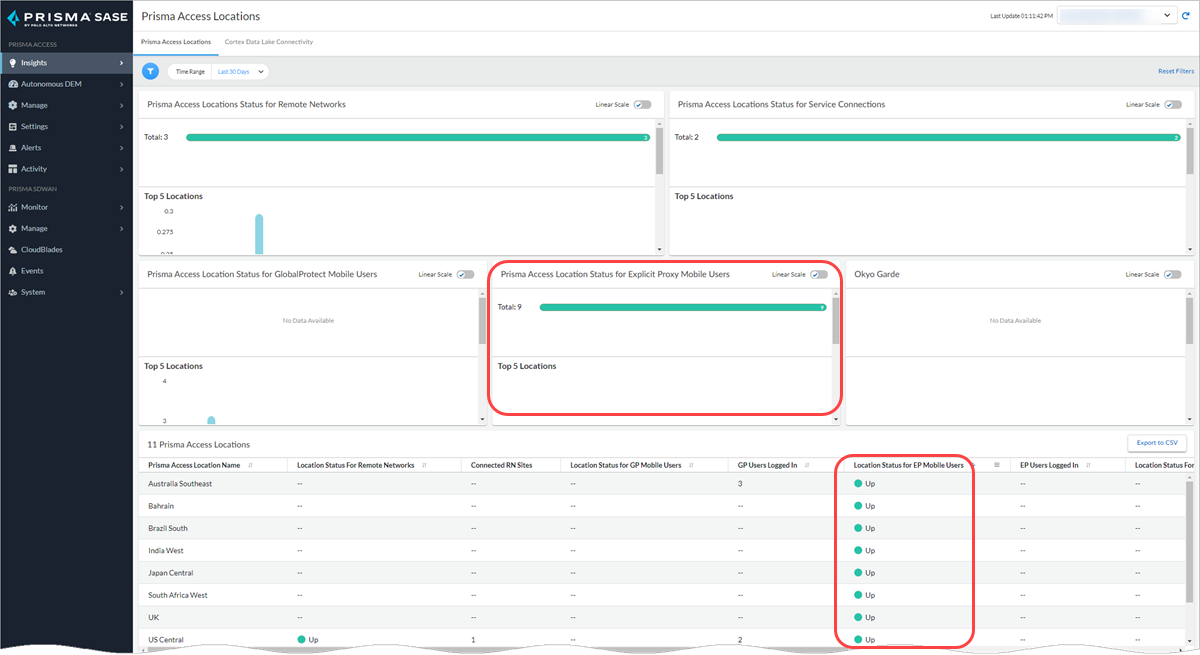 You can view the status of the explicit proxy mobile users managed for a specific Prisma Access location