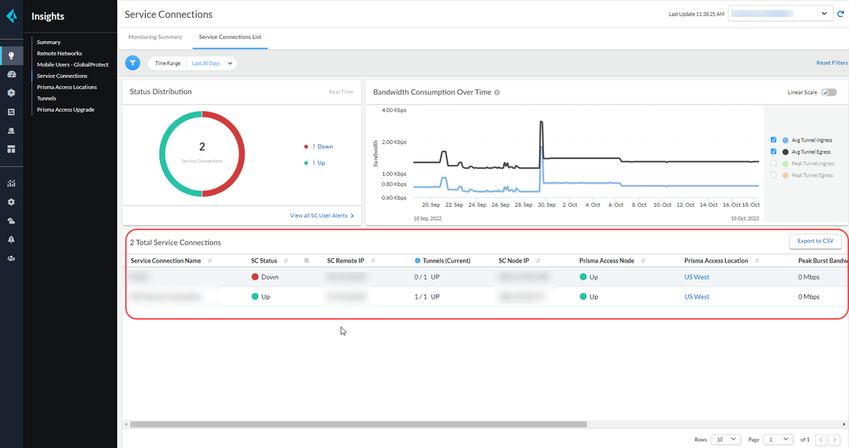 You can view service connections status and metrics in the Total Service Connections table using the sc_list