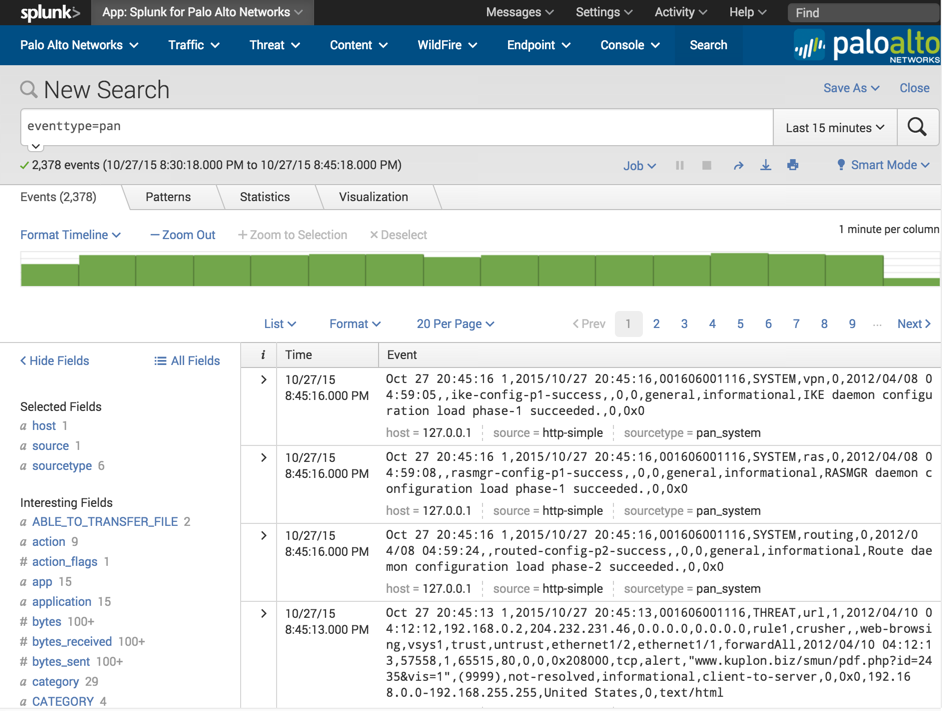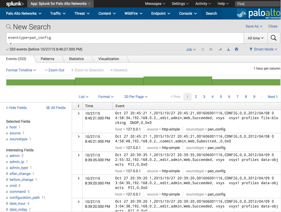 with 'All time' as the timeframe. If logs show up, then verify the timestamp of the logs is correct. If it is wrong, check that the clock and timezone on the Firewall/Panorama matches the Splunk server, or use NTP on both. See Time and Timezone Problems below for more detail.